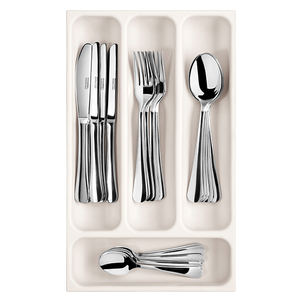 Предназначен за организирано съхранение на прибори за хранене с четири отделения. Разпределителя за прибори за хранене може лесно да се съедини с други разпределители FlexiSPACE, за да се постигне максимално използване на пространството в чекмеджетата на кухненския модул. Изработен от устойчива пластмаса. Размери: 22x37xH4.5cm