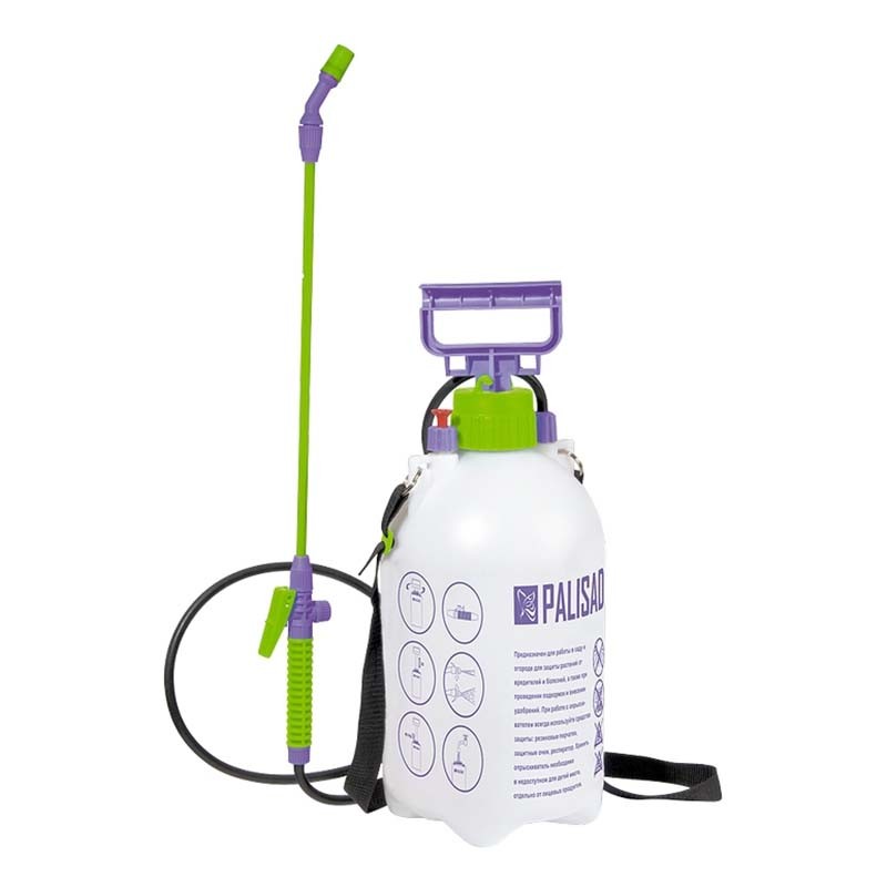 Ръчна пръскачка на марката PALISAD с обем 5 л, изработена от здрава ABS пластмаса. Използва се в градини за защита на растения от вредители и болести, както и по време на подхранване и торене.Конструкцията има здрава колба с измервателна скала, помпа за създаване на налягане, автоматичен вентил за контрол на налягането и маркуч. Пръскачката има дръжка с фиксатор, с помощта на която може да се пренася, както и колани за носене на раменете.Оборудвана е с разпръскваща дюза с възможност за регулиране на налягането.