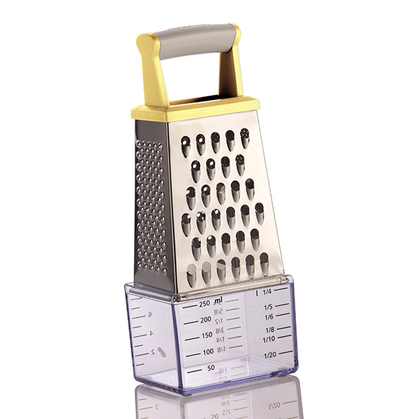 Четири страни за различен тип стъргане. Комплектът включва мерителна кутия за съхранение. Ергономична дръжка от устойчива пластмаса