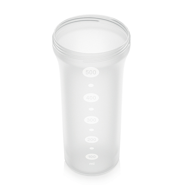 Контейнерът е с мерителна скала и две цедки с различни размери за дресинг и аериране на мляко. Изработен от устойчива пластмаса