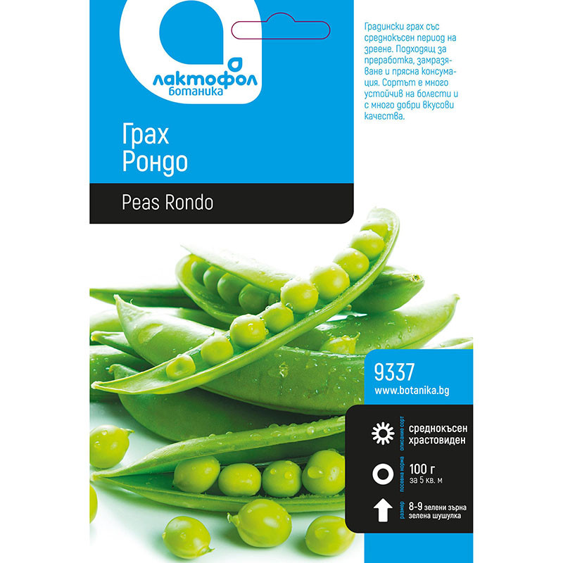 Семена грах Рондо на марката ЛАКТОФОЛ БОТАНИКА, подходящи за сеитба на открито през март - април и септември - октомври, като посевната норма е 100 гр/5 м2.Беритбата е през периода май - юли и ноември. Грахът Рондо е среднокъсен храстовиден сорт, с вегетационен период от 75 дни.Сортът е много устойчив на болести и с много добри вкусови качества, със среднокъсен период на зреене. Растенията са високи около 80 см, семената поникват за около 7 - 10 дни при минимална температура на почвата 8-10°C.Шушулките са тъмно зелени, с дължина 9-11 см, леко извити, с остър връх.Грахът е подходящ за преработка, замразяване и прясна консумация.