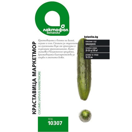 Семена краставица Маркетмор на марката ЛАКТОФОЛ БОТАНИКА, подходящи за сеитба за разсад през януари - март и на открито - през март - юни. Посевната норма е 20-30 гр/100 м2, като беритбата е през периода юли - септември.Краставицата Маркетмор е средноранен сорт салатна градинска краставица, с плодове с дължина 18-20 см, леко пъпчиви. Краставицата е богата на калий, ензими и соли.Сортът е толерантен на обикновена краставична мозайка, слабо чувствителен на брашнеста мана, не се влияе от резките температурни промени. Подходящ за отглеждане в полиетиленови оранжерии и на открито, като предпочита аерирани, бързозатоплящи се почви и защитени от вятър места. Нуждае се от редовно поливане и подхранване с азот, фосфор и калий.Краставицата Маркетмор спомага за отделянето на излишната вода от организма и подпомага храносмилането. Като съставка в козметични продукти благоприятства за гладка и стегната кожа.Семената са с тегло 2 гр.
