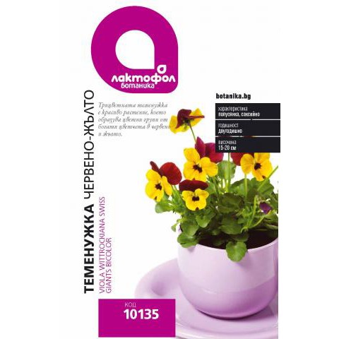 Семена за цветя Теменужка едра микс на марката ЛАКТОФОЛ БОТАНИКА, подходящи за сеитба на открито през май - август.Красиво растение, което образува цветни групи от богати цветчета в червено и жълто, с височина 15-20 см.Поставя се на полу-сенчесто място, за да не изгаря от слънцето. Може да бъде отглеждана и в сандъчета, но минималната им дълбочина трябва да бъде 30 см.Необходимо е често да се почиства от увехналите листа и цветове. Цветето обича богатата на хумус почва. Цъфти от март до септември.