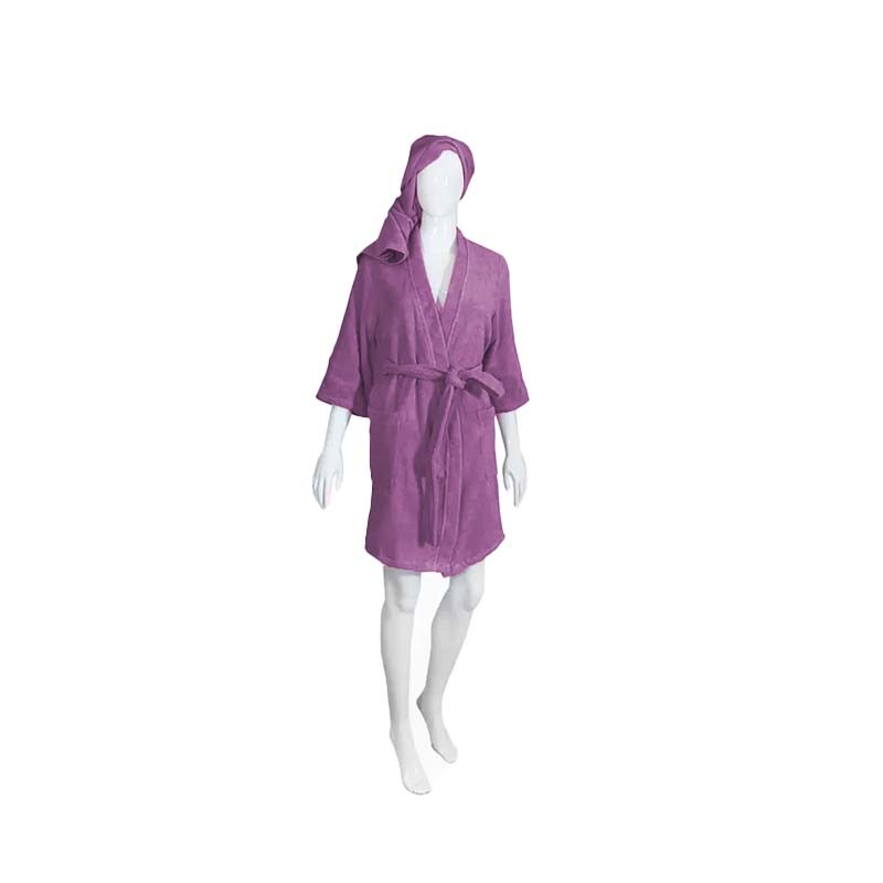 Елегантен дамски сет Релакс на марката BULGARIA TEX в цвят малина, състоящ се от втален, къс халат кимоно и хавлиена кърпа за глава с размери 60x110 см.Халатът и кърпата са изработени от 100% памук с плътност 320 гр/м².Отличават се с изключителна мекота и висока попиваемост.Чудесна придобивка за всяка жена, която е превърнала взимането на душ или вана в истинско изкуство.Халатът е размер S.