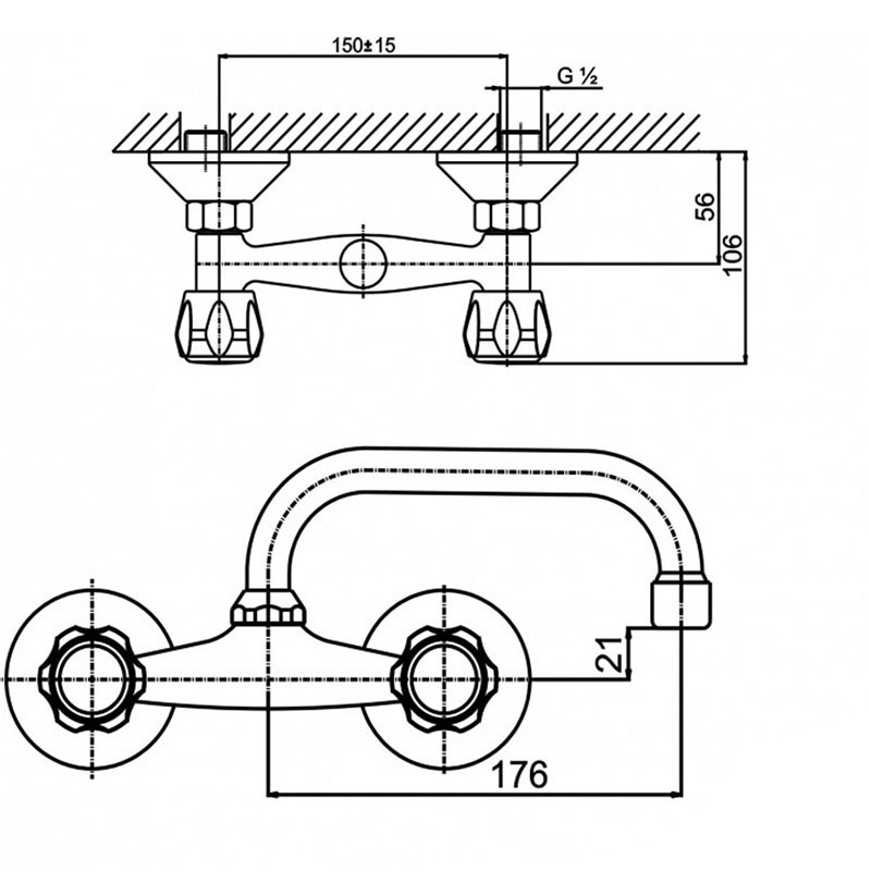 Стенен месингов смесител за кухненска мивка/умивалник, с две ръкохватки.