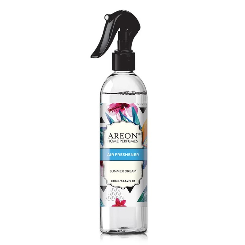 Спрей ароматизатор за дома Лятна мечта на марката AREON с дълготраен аромат, който ще освежи вашия дом. Спрей парфюмът смесва флорални и ориенталски нотки с мускус и плодови ухания.Предлага се в разфасовка от 300 мл.*Разклатете преди употреба.*Пръснете 2-3 пъти във въздуха.*Не пръскайте върху кожени, пластмасови, лакирани или боядисани повърхности и текстил, тъй като продуктът може да ги повреди.