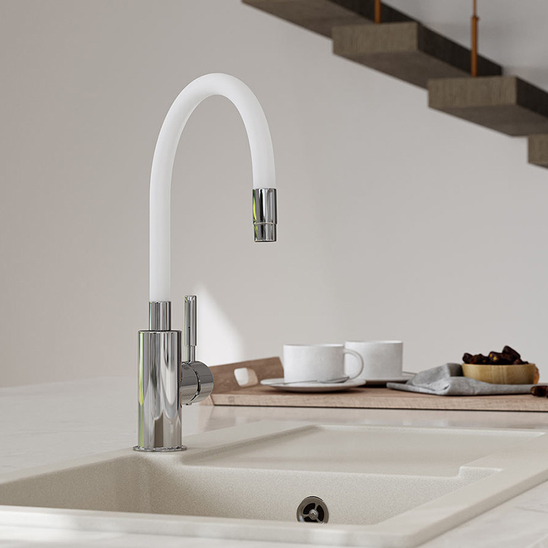 Стоящ смесител за кухня Zumba FERRO с гъвкав PVC чучур в бял цвят.Има възможност за свободно движение на чучура.Височината му може да се регулира от 280 мм до 440 мм, а дължината - от 150 мм до 350 мм.Батерията се характеризира с аератор М22x1 и гъвкави връзки G3/8 - M10x1.