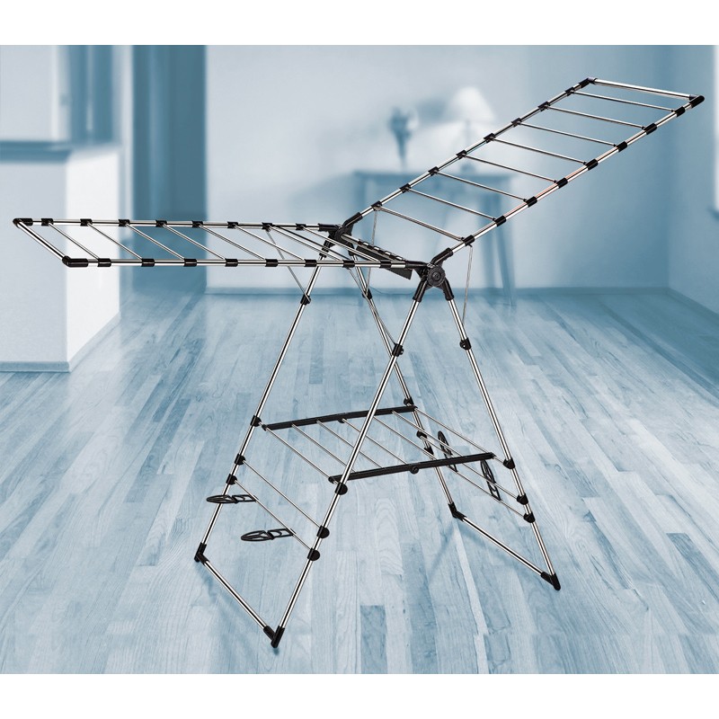 Изработен от алуминий, този сушилник е лек, но същевременно стабилен и устойчив на корозия. Хромираното покритие и висококачествената обработка гарантират дълъг живот на продукта. Благодарение на пластмасовите стопери сушилникът стои стабилно, без да надрасква пода, а допълнителните поставки са идеални за сушене на обувки или други по-малки артикули.