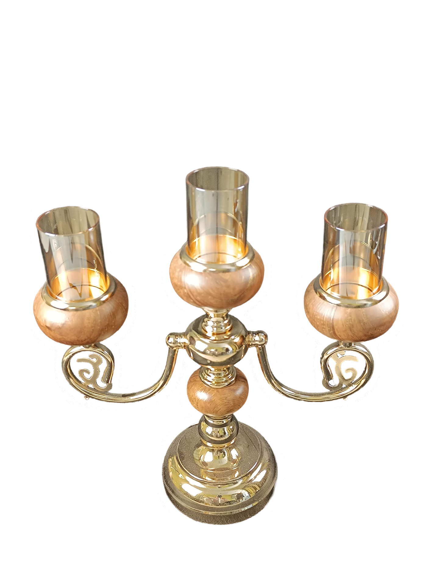 Свещник тройка златен с дървен пръстенметал със стъкло