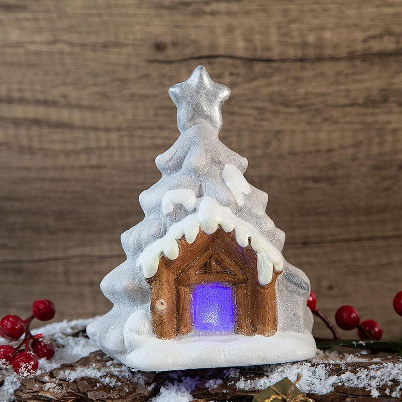 Светеща коледна къща, покрита със сняг, подходяща за декорация за дома или работното място.Коледната къщичка е изработена от керамика, с размери: 11.8x8.8x15 см.Тази чаровна светеща коледна къща ще ви пренесе в магичен коледен свят. Захранва се с три батерии LR41 (батериите са включени в цената).