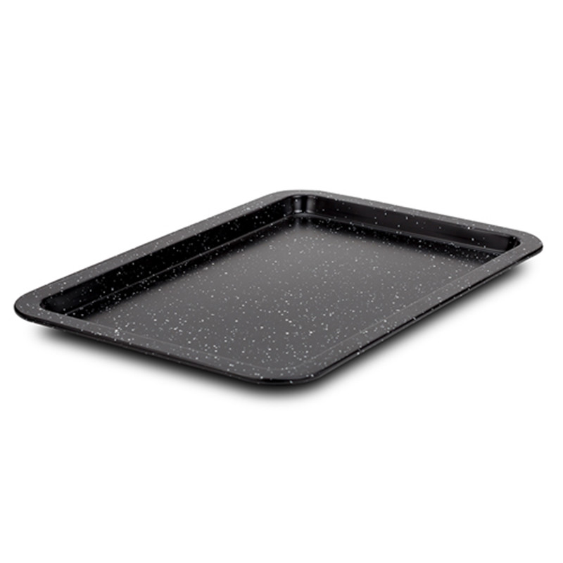 Тава за печене с незалепващо каменно покритие Nature NAVA с размери 43.5x29x1.5 см (Д/Ш/В).Тавата е изработена от въглеродна стомана, което гарантира равномерно разпределение на температурата и по-добри резултати при готвенето.Незалепващото покритие позволява лесно премахване на храната и лесно почистване на съда след употреба.Тавата е идеална за печене на сладкиши и бисквити, както и за печене на пица и малки порции храна, като зеленчуци или скариди.Подходяща е и за повторно затопляне на ястие във фурната.