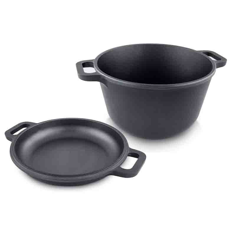 Тенджера и тиган Титан II на руската марка НЕВА МЕТАЛЛ ПОСУДА от излят алуминий и с керамично покритие.Уникалният съд е с обем 3 л.По-малкият диаметър на дъното (10.7 см) и по-широкият диаметър на горната част (20 см) спомагат за равномерно разпределение на температурата и влажността в тенджерата. Дебелината на дъното е 0.6 см, на стената 0.4 см, а височината на стената - 17.7 см.Приложението варира от класическо задушаване или приготвяне на пара, до готвене с отворен капак и използване на отлетия капак като независим тиган или съд за печене. Съдът е подходящ за газови, електрически, стъклокерамични и индукционни котлони, както за съдомиялна машина.