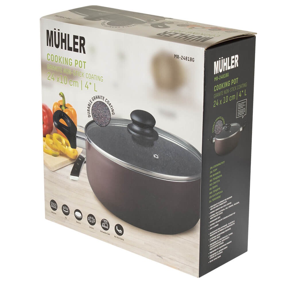 Тенджера MR-2481BG New от серията Petra на марката MUHLER, подходяща за здравословно готвене без мазнина.Съдът е изработен от висококачествен алуминий за максимална топлопроводимост и е с гранитно покритие с висока твърдост, устойчивост на износване и добра незалепваща способност.Тенджерата е в кафяв цвят, с вместимост 4 л и размери ø24x10 см.Подходяща е за електрически, газови, стъклокерамични, халогенни и индукционни котлони, както и за почистване в съдомиялна машина.Заложете на качествена и лесна за почистване тенджера и приготвяйте с удоволствие вкусни ястия за вашето семейство.