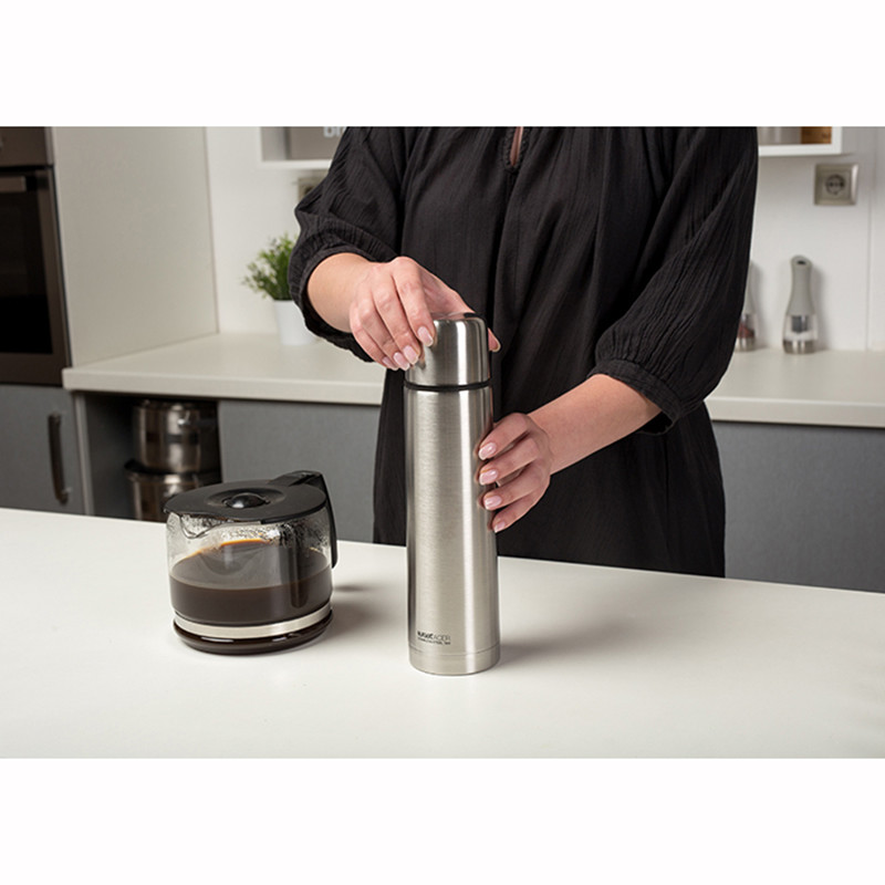 Двустенна термочаша от серията Acer на NAVA, изработена от висококачествена неръждаема стомана 304 (18/8).Благодарение на двойната стена поддържа температурата на топли и студени напитки до 12 часа.Термочашата се затваря херметически, а капакът може да се използва като чаша.Продуктът е изключително лек, идеален за офиса, плажа, при пътуване, на къмпинг и всякакви дейности на открито.Подходящ е за съдомиялна машина.Термочашата е с диаметър 8 см, височина 32 см и вместимост 1 л.*Времето за поддържане на температурата може да варира в зависимост от количеството на съдържанието, температурата на напитката или температурата на външната среда.