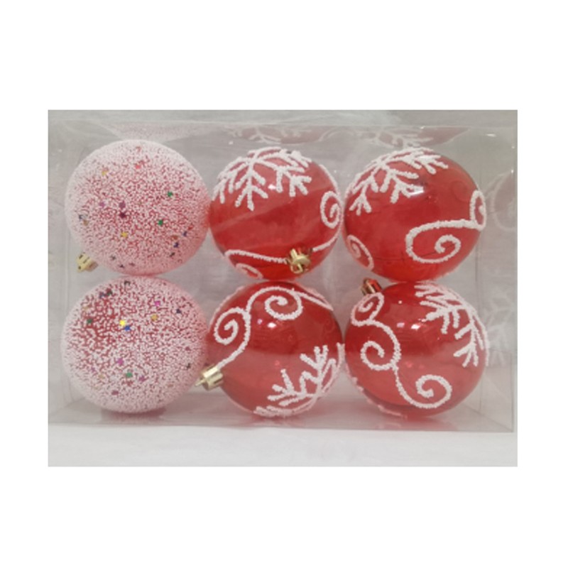 Комплект от шест коледни топки с окраски, предназначени за украса на елха.Топките в комплекта са два модела: розово-бели с шарени точки и червени с бели коледни мотиви.Внесете коледен дух у дома и се погрижете за бляскавата украса на вашата елха с красиви коледни топки. Топките са с диаметър 8 см.