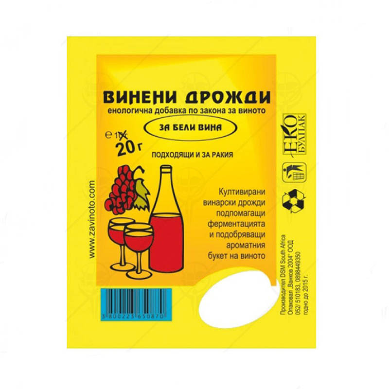 Дрождите за бели вина се използват при предизвикване на алкохолна ферментация за подобряване аромата и вкуса. Съдържанието се изсипва в 0.5л. хладка (25-30°) вода и се разбърква. След това се изсипва в 10л. съд и се добавя 2-3 литра от ширата. Оставят се да престоят няколко часа и после се добавят към основния материал. Дозировка: 20гр. на 100-200 литра вино или плодов материал. Има и сертификат за качество.